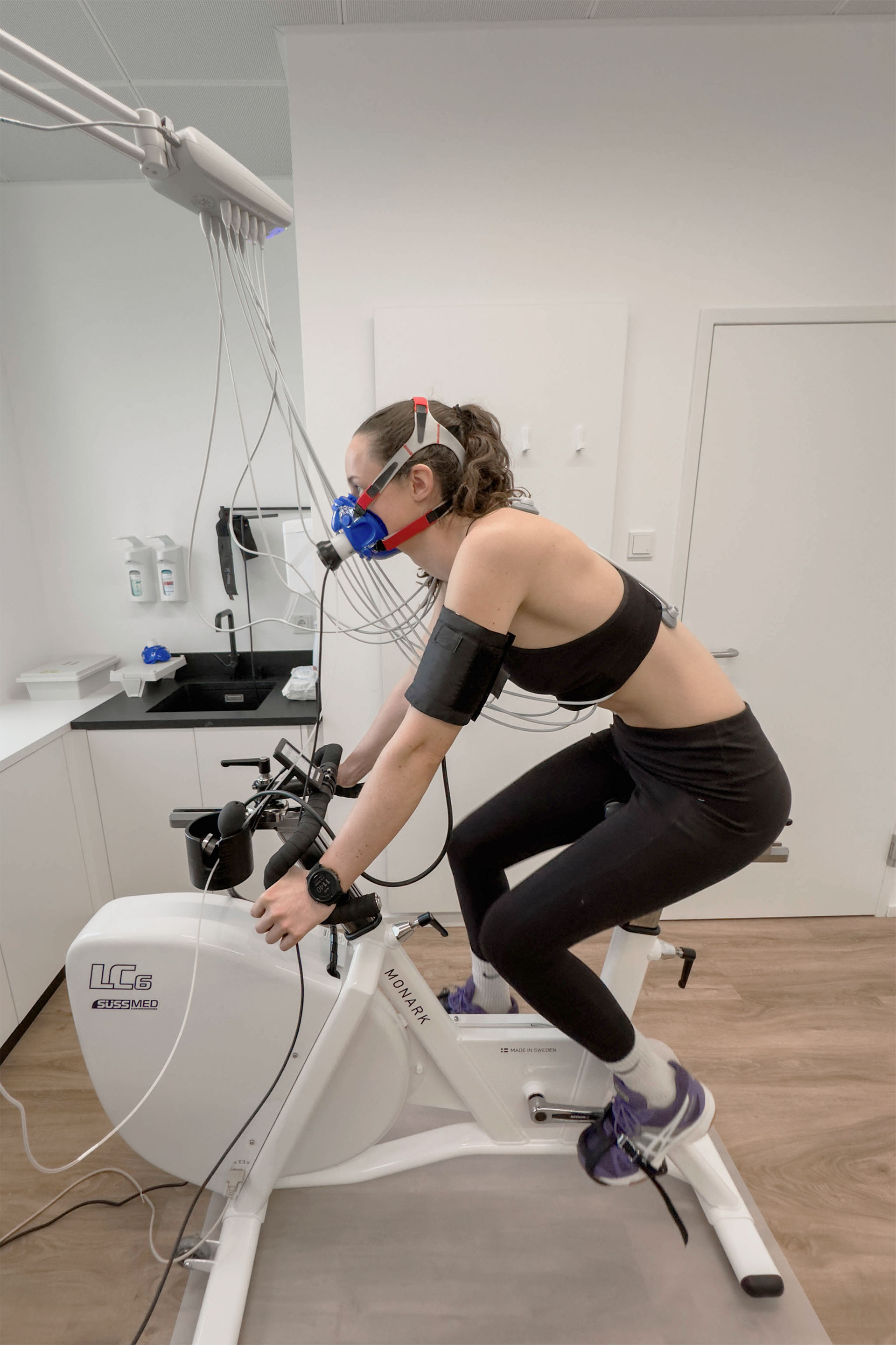 - Spiroergometrie (Atemgasanalyse unter Belastung) zur Bestimmung von VO₂max, anaerober Schwelle und Herzfrequenzzonen